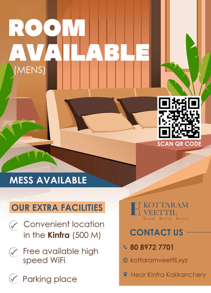Our hostel boasts a serene and study-friendly environment, ideal for residents aiming to achieve academic or professional goals. If you're looking for better living options near Kakkanchery, Kottaram Veettil Men's Hostel guarantees value for money with modern amenities and a friendly atmosphere. Visit our Contact Page to book your stay and enjoy easy access to key locations like Kinfra Tech Park and Kakkanchery town.